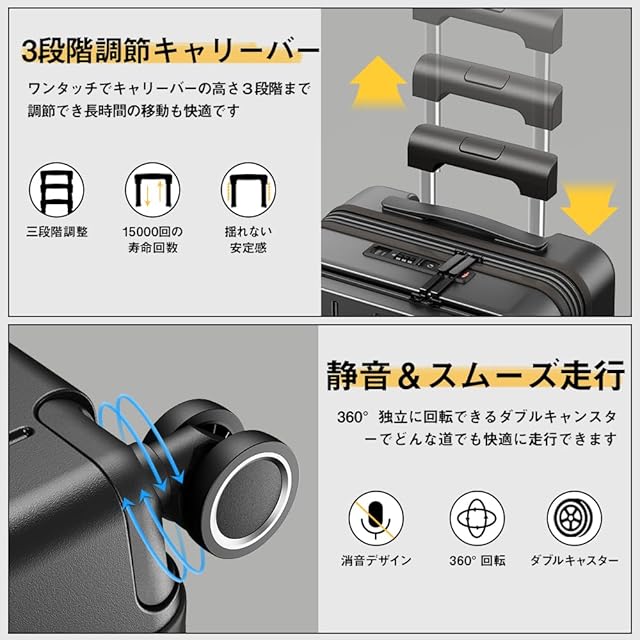 ✅【静音ダブルキャスター・超軽量設計|スムーズな操作性】 360度回転する静音ダブルキャスターと軽量設計で、移動時のストレスを大幅に軽減。人混みの中や段差のある場所でもスムーズな走行が可能です。スーツケース 拡張機能付きでありながら、持ち運びやすさを重視。スーツケース フロントオープンタイプで、機能と操作性を両立させた優秀なキャリーバッグ・キャリーケースです。
