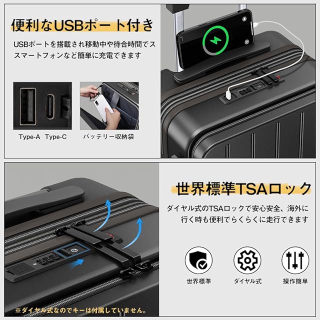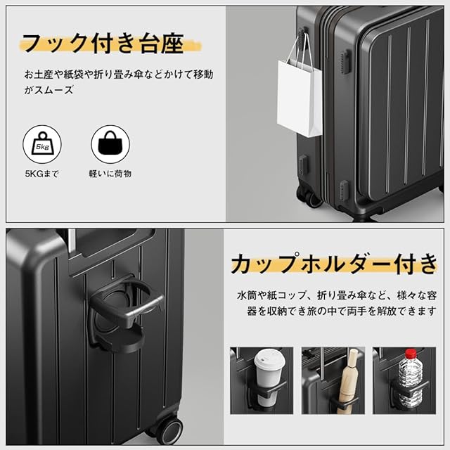 ✅【USBポート・カップホルダー・隠しフック搭載|利便性に優れたスーツケース】 スマホ充電ができるUSBポート、カップホルダー、荷物を吊るせる隠しフックなど、出先での快適性を追求した多機能設計のスーツケース 拡張機能付き。スーツケース フロントオープンだから取り出しも簡単で、時間が限られた移動中にも便利。旅行・ビジネスどちらにも活躍する、洗練されたキャリーバッグ・キャリーケースです。
