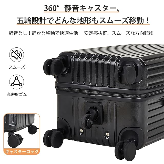 【5輪設計&テレスコピックハンドル】5輪設計で、重量を分散し、安定性を確保。361度回転可能なスムーズなキャスターで、あらゆる地形に対応。キャスターロック機能付きで、スーツケース ストッパー付きとして、移動中も安心して固定可能。★厚めで強化されたハンドルで、多段階調節可能で、身長に合わせて調整できます。スムーズな引き出し&低振動で、快適な操作性を実現。キャリーバッグとしての使いやすさを追求しました。