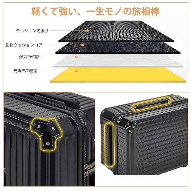 【軽量設計 & 耐久性】このキャリーケースはABS+PC素材を使用し、軽量で頑丈な設計。旅行中の負担を軽減します。防水・防スクラッチ加工で、天候や輸送環境に強く、長持ちします。アルミニウムコーナーガードで、角の衝撃を防ぎ、耐久性を向上。4面ハンドル付き設計で、どの角度からでも持ち運びが簡単。大型キャリーケースとしての利便性を最大限に活かし、機内持ち込みにも最適な軽量設計です。
