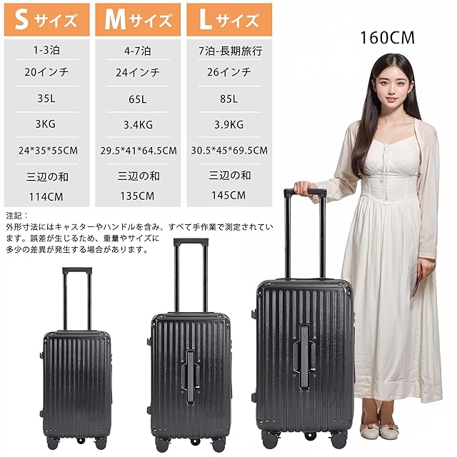 【軽量設計 & 耐久性】このキャリーケースはABS+PC素材を使用し、軽量で頑丈な設計。旅行中の負担を軽減します。防水・防スクラッチ加工で、天候や輸送環境に強く、長持ちします。アルミニウムコーナーガードで、角の衝撃を防ぎ、耐久性を向上。3面ハンドル付き設計で、どの角度からでも持ち運びが簡単。大型キャリーケースとしての利便性を最大限に活かし、機内持ち込みにも最適な軽量設計です。