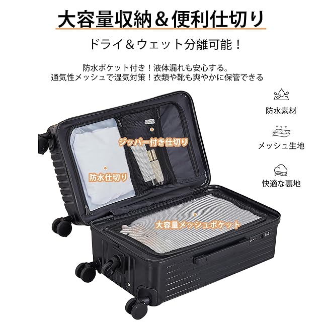 【収納機能 & 便利な仕切り】仕切りポケット&収納バッグで、ドライ&ウェット分離が可能。洗面用品や衣類を分けて収納。防水ポケットで、液体の漏れを防ぎ、貴重品を保護。通気性メッシュポケットで、衣類や靴の湿気を逃がします。キャリー ケースとしての実用性を高める、便利な収納設計です。