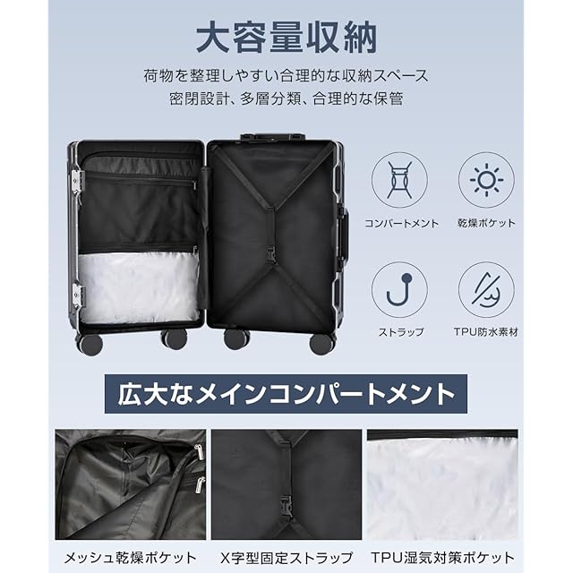 [Tatsui] スーツケース 機内持ち込み キャリーケース アルミ フレーム タイプ 大容量 ストッパー付き 耐衝撃 USBポート TSAローク搭載 カップホルダー付き 隠しフック機能 便利グッズ キャリー ケース 軽量 静音 大型 360度回転キャスター キャリーバッグ ビジネス 出張 旅行