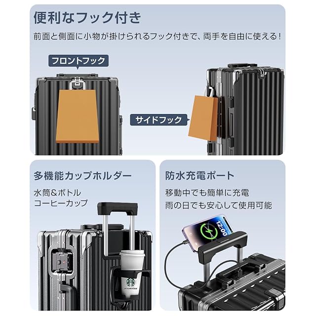 【USBポート&カップホルダー付き|便利グッズ満載】本体側面にはUSBポートを搭載(※モバイルバッテリー別売)、移動中でもスマホの充電が可能。カップホルダーも装備されており、ドリンク片手の移動がさらに快適に。便利な隠しフック機能でバッグや買い物袋も引っ掛けられ、旅先や空港での利便性を追求したキャリーケースです。