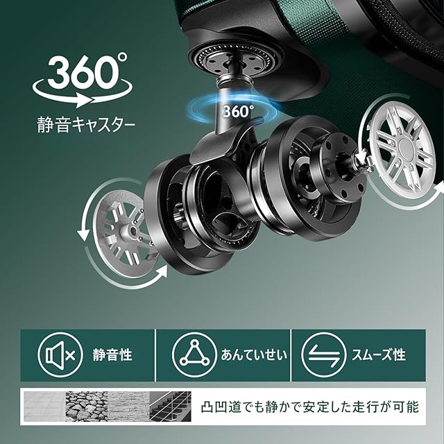 【TSAローク搭載&360°静音キャスター】スーツケースにはTSA税関ロックが装備されており、国際保安検査基準に適合しており、税関検査を容易にするとともに、物品の安全を確保することができます。また、高弾性TPE衝撃軽減素材のキャスターを採用し、より静かで耐摩耗性も向上しています。
