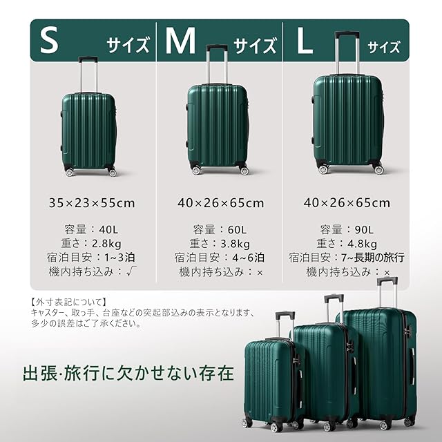 【サイズ情報】Sサイズ:35×23×55 cm、三辺合計:114 cm、機内持ち込み可。容量:40 L、宿泊基準:1-3泊。Mサイズ:40×26×65 cm。容量:60 L、宿泊基準:4 ~ 6泊。※商品の外寸は、トップとサイドハンドル、サイド固定脚、キャスターのマークを取る。寸法測定には若干の誤差がありますのでご了承ください。