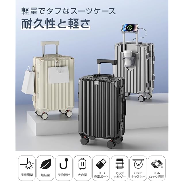 [Tatsui] スーツケース 機内持ち込み キャリーケース アルミ フレーム タイプ 大容量 ストッパー付き 耐衝撃 USBポート TSAローク搭載 カップホルダー付き 隠しフック機能 便利グッズ キャリー ケース 軽量 静音 大型 360度回転キャスター キャリーバッグ ビジネス 出張 旅行