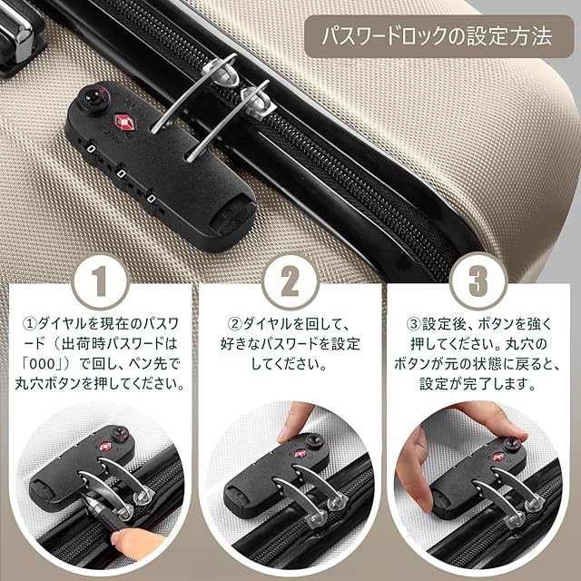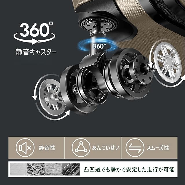 【TSAローク搭載&360°静音キャスター】スーツケースにはTSA税関ロックが装備されており、国際保安検査基準に適合しており、税関検査を容易にするとともに、物品の安全を確保することができます。また、高弾性TPE衝撃軽減素材のキャスターを採用し、より静かで耐摩耗性も向上しています。
