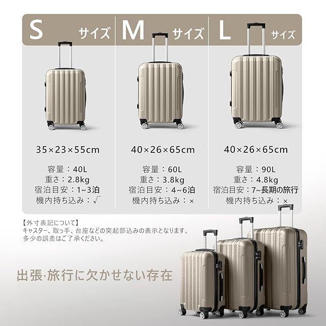 【サイズ情報】Sサイズ:35×23×55 cm、三辺合計:114 cm、機内持ち込み可。容量:40 L、宿泊基準:1-3泊。Mサイズ:40×26×65 cm。容量:60 L、宿泊基準:4 ~ 6泊。※商品の外寸は、トップとサイドハンドル、サイド固定脚、キャスターのマークを取る。寸法測定には若干の誤差がありますのでご了承ください。
