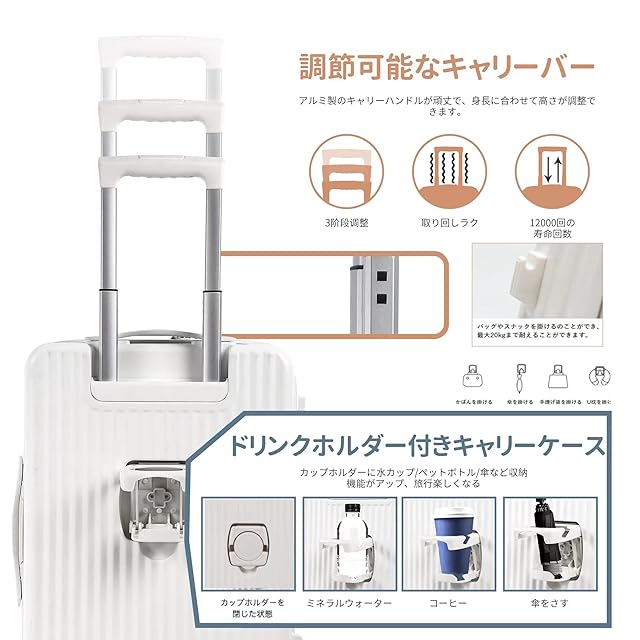 【YKK純正ファスナー・素材】スーツケースはPC素材を採用し、耐衝撃性に優れた上、高弾性で、変形しにくい。エンボス加工、傷つきにくい。ABS素材より頑丈で耐久性に優れ、アルミフレームスーツケースより軽量で持ち歩きやすい。内装も日本のYKKファスナーを採用され耐摩耗性また丈夫性も優れます。