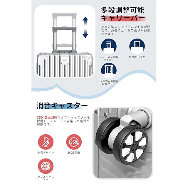 【高品質なボディ&多段階調節キャリーバー】軽量で耐久性に優れたABS+PC素材を使用し、耐衝撃性も抜群です。人気のアルミフレームを採用しており、ビジネスからカジュアルまで幅広いシーンで活躍します。アルミ製キャリーバーはボタン一つで高さを簡単に調節でき、身長や利用シーンに合わせた快適な操作が可能です。