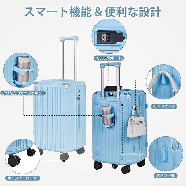 [VECELO] スーツケース キャリーケース USBポート付き 超軽量 多機能 大型 静音 アルミフレーム 耐衝撃 85L 3.9kg ブルー