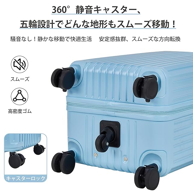 【5輪設計&テレスコピックハンドル】5輪設計で、重量を分散し、安定性を確保。368度回転可能なスムーズなキャスターで、あらゆる地形に対応。キャスターロック機能付きで、スーツケース ストッパー付きとして、移動中も安心して固定可能。★厚めで強化されたハンドルで、多段階調節可能で、身長に合わせて調整できます。スムーズな引き出し&低振動で、快適な操作性を実現。キャリーバッグとしての使いやすさを追求しました。
