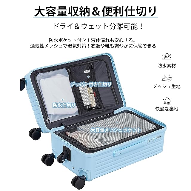 【収納機能 & 便利な仕切り】仕切りポケット&収納バッグで、ドライ&ウェット分離が可能。洗面用品や衣類を分けて収納。防水ポケットで、液体の漏れを防ぎ、貴重品を保護。通気性メッシュポケットで、衣類や靴の湿気を逃がします。キャリー ケースとしての実用性を高める、便利な収納設計です。