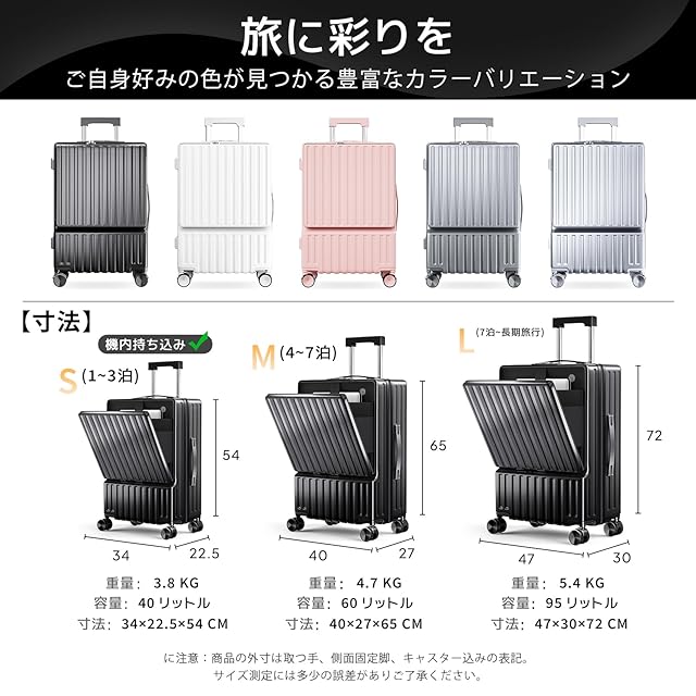 【市場最軽量・超大容量】市場最軽量仕様として、一般的なスーツケースより、平均1kg重さが遠います。長時間スーツケースをもって移動する場合や頻繫に出張、旅行の方におすすめです。Sサイズ、機内持ち込みにも最適です。さらに、メッシュポケット内蔵され合計4箇所メイン収納があります。大容量収納×合理的なデザイン、コンパクトながらも十分な収納力があります!機能的な仕切りやポケットで整理整頓もバッチリ!大容量なスーツケースは収納便利、旅行や故郷帰りなど最適なスーツケースです。