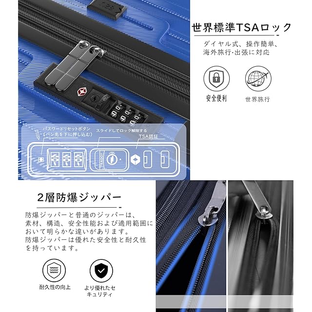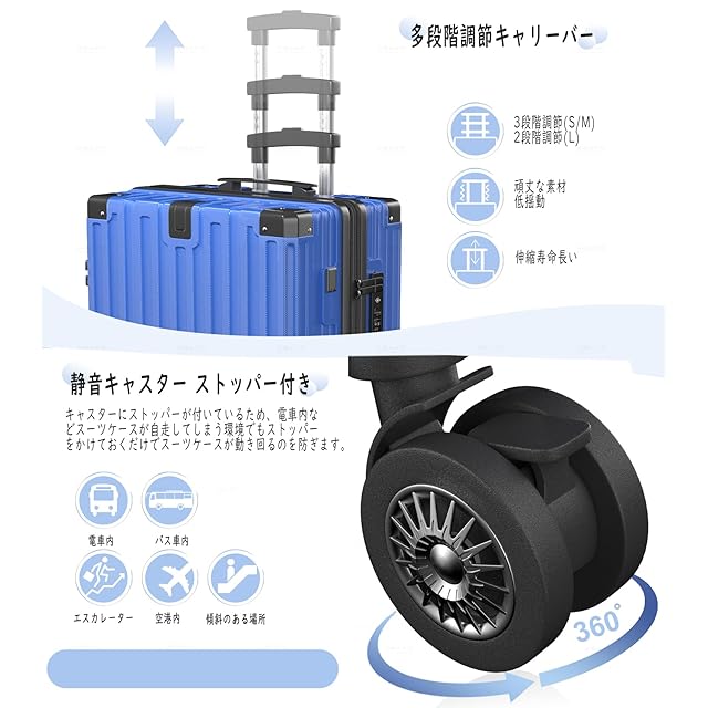 【三段調節キャリバー・世界基準の安全性】超軽量のアルミニウム製キャリバー、高さ三段階調節、ご自分の身長に合わせてスムーズに調整が可能です。耐振性に優れるデザインで荷物を引きかける時、しっかりしています。また、滑りにくいソフトハンドルで長い時間の手提げでも手は疲れません。海外旅行には欠かせないTSAダイヤル方式のロックが搭載されており、外出がより安全になります。※鍵は航空会社検査専用のため本製品には付属しておりません。