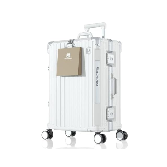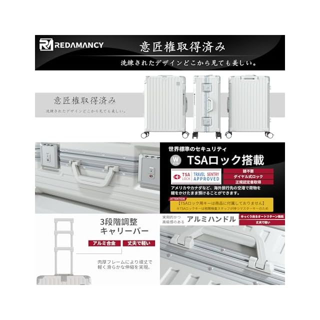[Redamancy] 現役客室乗務員が設計を指導 スーツケース キャリーバッグ 【日本企業企画】 キャリーケース 超軽量 大型 アルミフレーム TSAロック搭載 ストッパー付き 360°静音ブレーキホイール フロントオープン 荷物フック 超軽量 耐衝撃 頑丈タイヤ 海外旅行出張(3-5泊 24インチ 65L ホワイト)