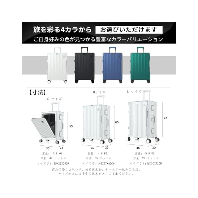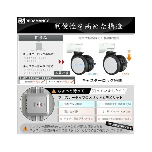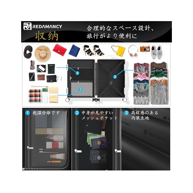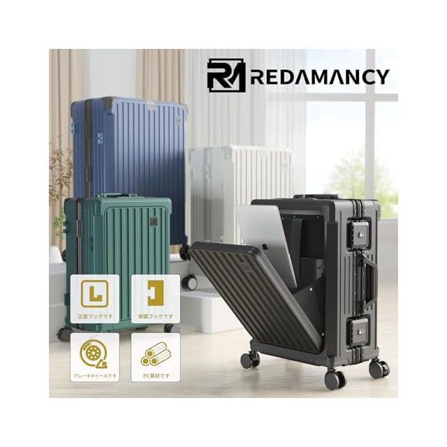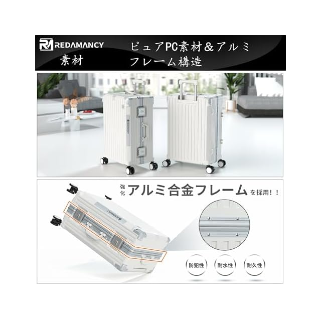 【軽量で耐久性のPC素材 & 包角保護 & アルミフレーム】高品質ポリカーボネート(PC)素材:軽量でありながら非常に丈夫な構造を実現。衝撃に強く、長期的な使用でも変形しにくいので、安心してお使いいただけます。包角保護:には強化された包角保護が施されているため、落下時の衝撃からスーツケースを守り、外観も美しく保てます。アルミニウムフレーム:アルミニウム製のフレームを採用し、全体的な強度を向上させ、耐久性を高めています。この特徴の組み合わせにより、このスーツケースは市場平均より30%耐久性が高くなっている!Redamancyは、お客様の満足度を最優先に考え、最高品質の製品をお届けします。万が一問題があった場合は、迅速に対応いたします。