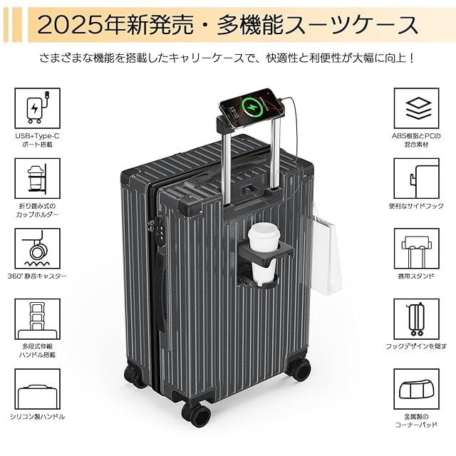 【USB+Type Cポート+飲料スタンド+携帯スタンド多機能キャリーケース】①USB充電ポートを備え、いつでも電子機器を充電できる。②スーツケースの背面には折りたたみ可能なカップホルダーが設置されており、飲み物、ボトル、カップ、傘などを簡単に取り出して入れることができます。③スーツケースのハンドルにはスマホスタンドが付いており、動画やビデオ通話を見たり、両手を解放したりするのに便利です。