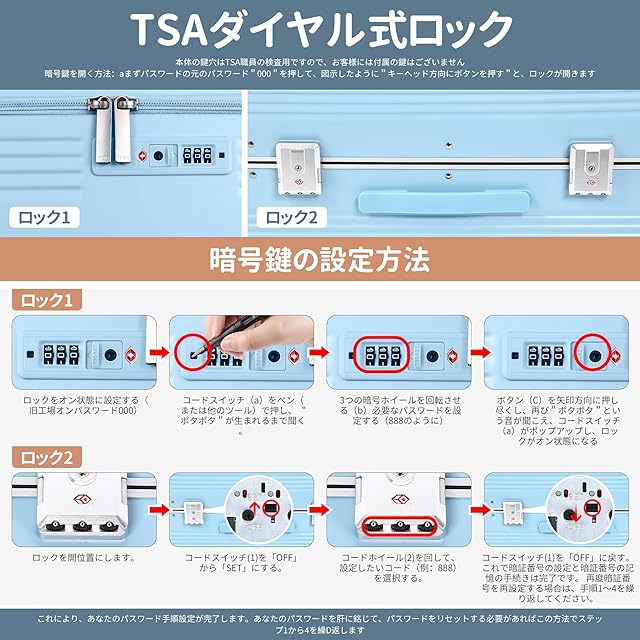 【ダイヤル記憶式TSAロック】セキュリティ面ではカギの持ち歩きが不要な3ケタのダイヤル式TSAロックを搭載。TSAロック搭載のラゲージは、TSA職員が特殊ツールで解錠・検査するので、施錠したまま預けることができます。