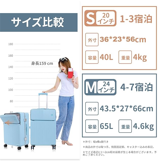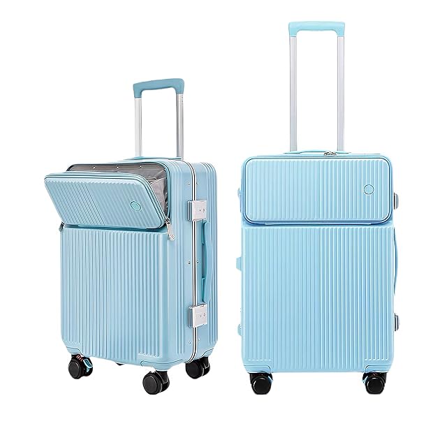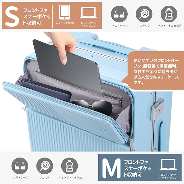 [Spyplan] キャリーケース スーツケース 機内持ち込み フロントオープン 可愛い 多機能 トップオープンパソコンケース アルミフレーム キャスター ストッパー付き キャリーバッグ カップホルダー付き キャスターロック付き 超軽量 トランク 人気 頑丈 TSAロック搭載 ブレーキ止まる360度回転 修学出張入院 3泊4日,ブルー M サイズ, 60リットル