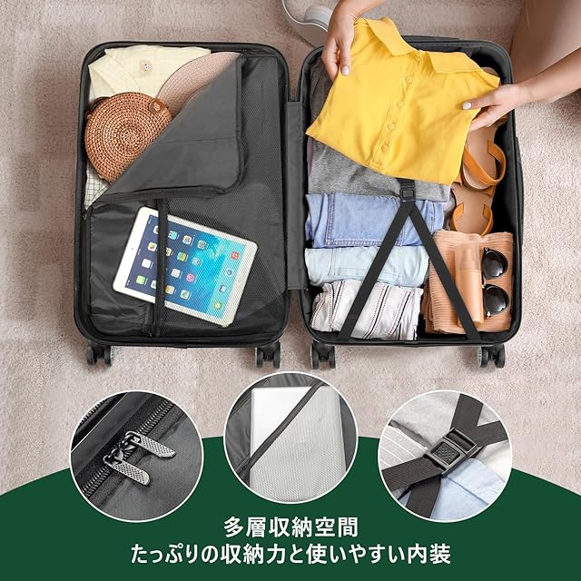 【驚きの収納力!荷物を効率的に整理整頓】 キャリーバッグ は旅行や出張で必要なアイテムをたっぷり収納できる スーツケース 大容量デザイン。キャリーケース は仕切りポケットや固定ストラップが付いており、荷物の整理が簡単で中身が崩れる心配もありません。靴、服、ガジェット、スキンケア用品など、用途に応じてきちんと整理でき、荷造りがストレスフリーに。