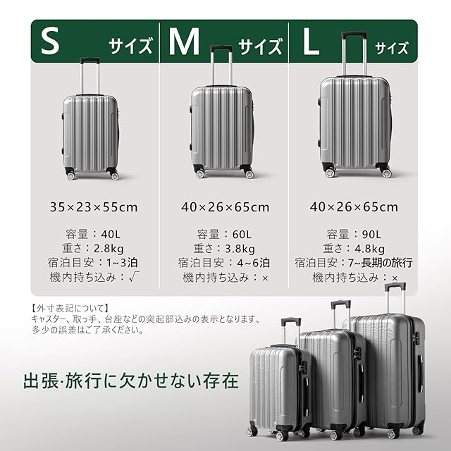 【サイズ情報】Sサイズ:35×23×55 cm、三辺合計:114 cm、機内持ち込み可。容量:40 L、宿泊基準:1-3泊。Mサイズ:40×26×65 cm。容量:60 L、宿泊基準:4 ~ 6泊。※商品の外寸は、トップとサイドハンドル、サイド固定脚、キャスターのマークを取る。寸法測定には若干の誤差がありますのでご了承ください。