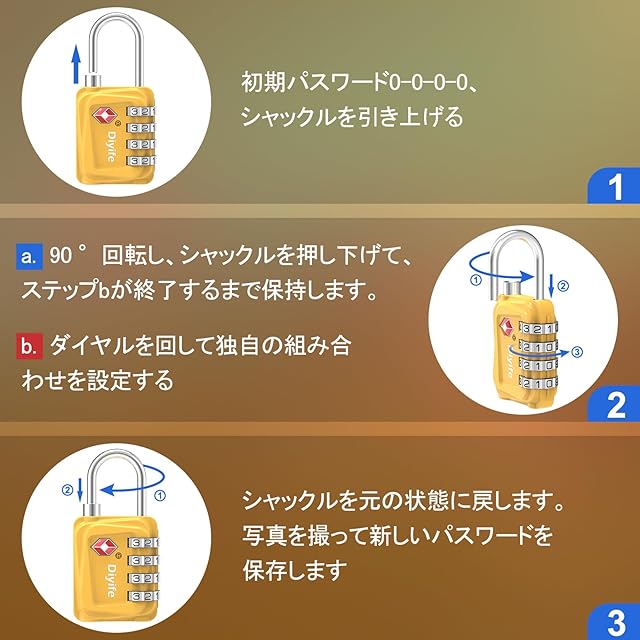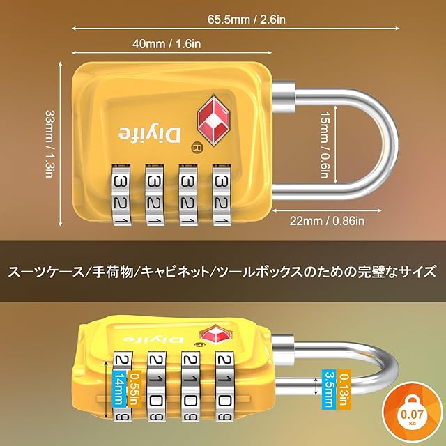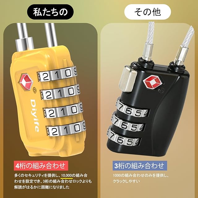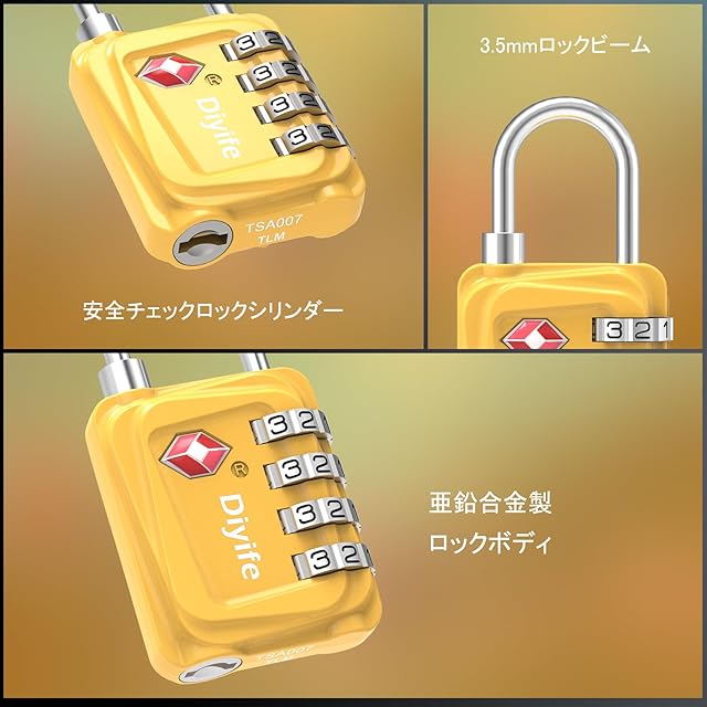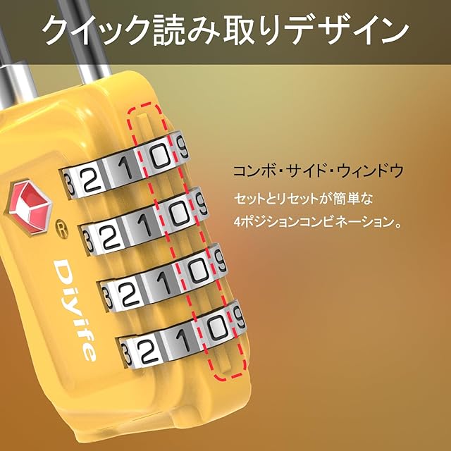 TSA 南京錠, [2 個] Diyife 4桁ダイヤル南京錠 スーツケース用 バッグ用, ワイヤーロック,スーツケース ロック海外旅行用鍵 ジムロッカー荷物 イエロー