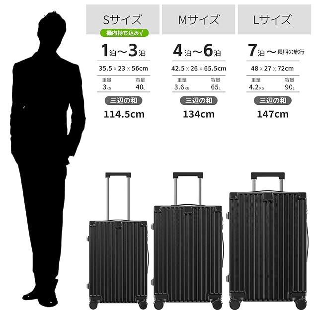 【サイズ情報】Sサイズ:35.5×23×56cm、三辺合計:114.5cm、機内持ち込み可。容量:40L、宿泊基準:1-3泊。Mサイズ:42.5×26.5×66cm。容量:65L、宿泊基準:4-6泊。Lサイズ:48×27×72cm。容量:95 L、宿泊基準:7泊~長期旅行。※商品の外寸は、トップとサイドハンドル、サイド固定脚、キャスターのマークを取る。寸法測定には若干の誤差がありますのでご了承ください。