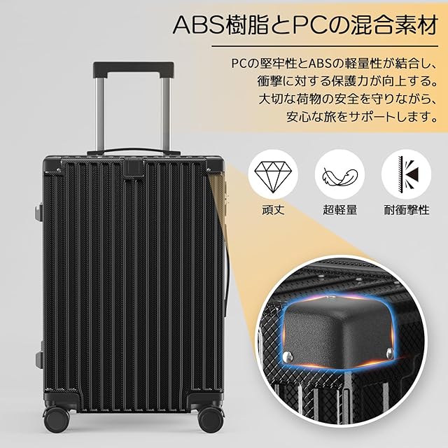 【2025年6月新作&最軽量&大容量】当社の最新スーツケースは、耐久性と軽量性を追求し、ABS樹脂とPCの混合素材を使用して製造されています。純粋なABS素材に比べて強固で、純粋なPC素材よりも軽量であり、さらに傷つきにくく、衝撃にも強い特性を持っています。おしゃれなストライプデザインと独特のマット質感で、女性でも簡単に持ち運べる流行の旅行カバンです。