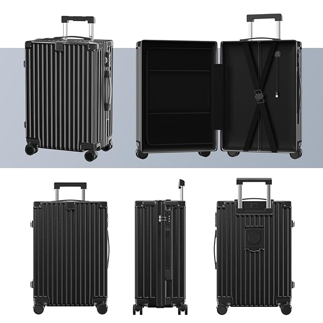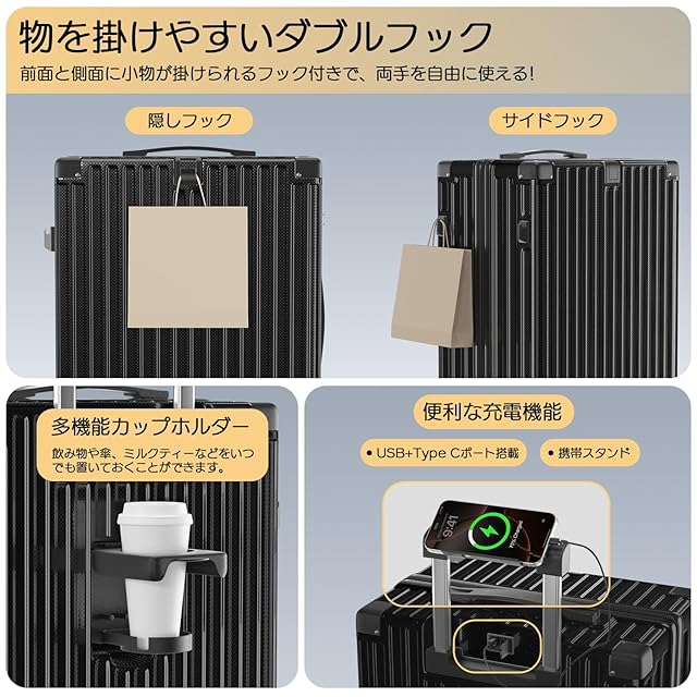 [SupTrip] スーツケース 機内持ち込み 超軽量 キャリーケース 多機能 キャリーバッグ USBポート付き カップホルダー付き 隠しフック機能 USB+Type C充電機能 大型 静音 ダブルキャスター 耐衝撃 360度回転 軽量 ビジネス 修学 泊まる 旅行 出張 (ブラック, M (4~6泊/65L))