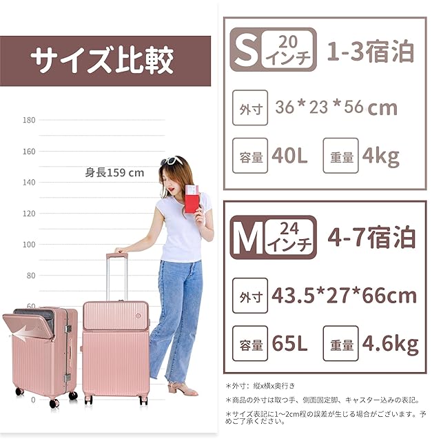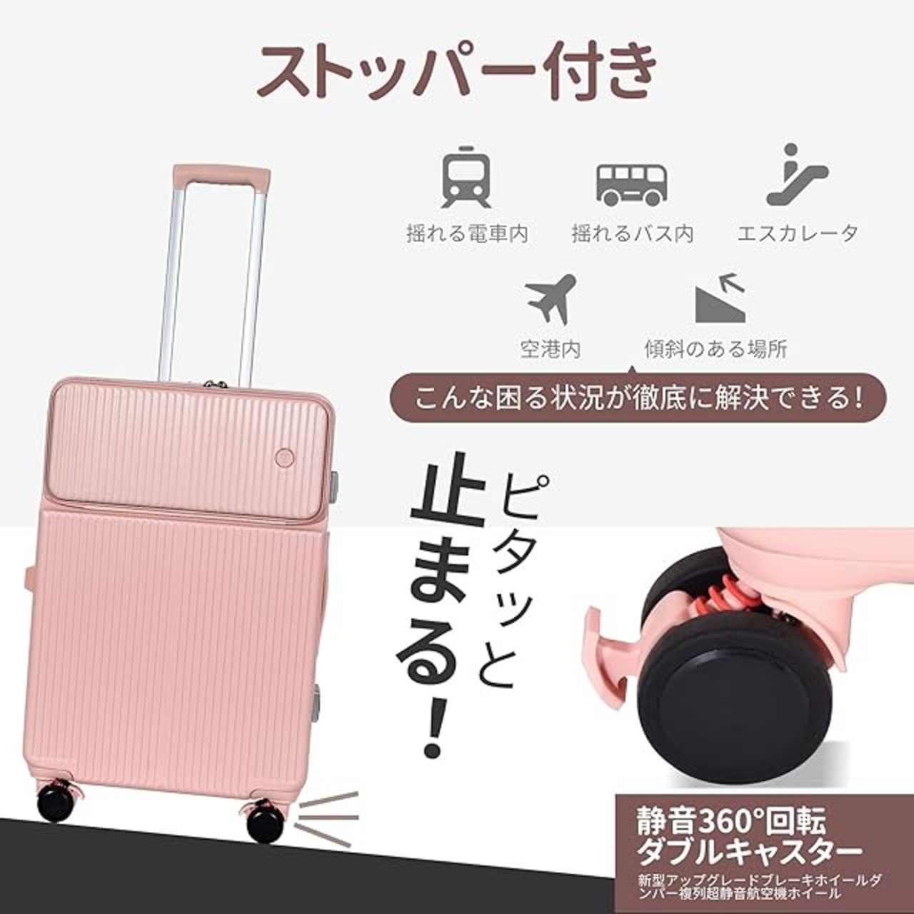 【新登場・キャスター ストッパー付き】1、走行中の車内や坂道で転がらない。ブレーキはキャスターのボタンで操作できます。2、走行中の揺れる電車内でもストッパー(ブレーキ)機能でピタっと自立。乗降時や座席の離着席時などではすぐにストッパー解除ができるのでスムーズに移動を再開することができます。 【YKK純正ファスナー・素材】スーツケースはPC素材を採用し、耐衝撃性に優れた上、高弾性で、変形しにくい。エンボス加工、傷つきにくい。ABS素材より頑丈で耐久性に優れ、アルミフレームスーツケースより軽量で持ち歩きやすい。内装も日本のYKKファスナーを採用され耐摩耗性また丈夫性も優れます。