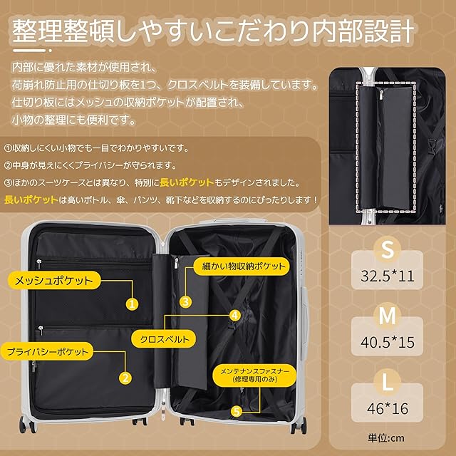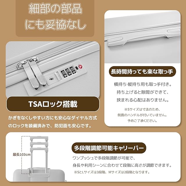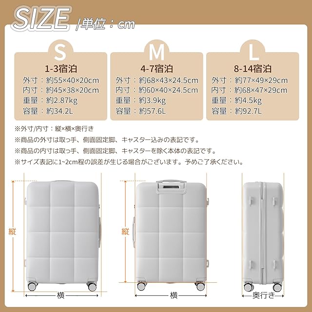 【商品仕様】※S size:外寸:約55×40×20cm 内寸:約45×38×20cm 本体重量:約2.87KG 、1~3泊に似合い。Sサイズは機内持込が可能なスーツケースです。飛行機内だけでなく、一人旅行や故郷帰りの新幹線やバスなどの車内移動も便利なスーツケースです。※M size:外寸:68×43×24.5cm 内寸:約60×40×24.5cm 本体重量:約3.9KG、4-7泊以上 。※L size:外寸:約77×49×29cm 内寸:約68×47×29cm 本体重量:約4.5KG、7泊以上。