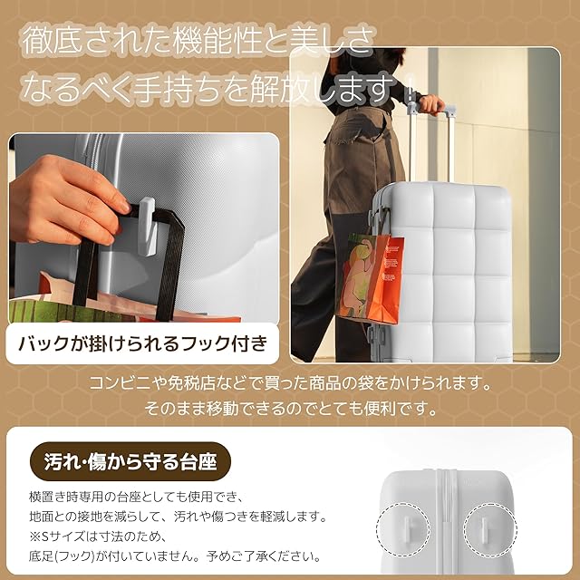 【フック機能搭載・収納力もプラス 】滑りにくいソフトハンドルで長い時間の手提げでも手は疲れません。隠しフックが搭載されており、バッグなどを掛けて、旅行中の手への負担を軽減してくるスーツケース。また、仕切りと複数のポケットで整理整頓がしやすい内装レイアウト。たくさんの小物を入れることはできます。X型ベルトが完備され、荷物崩れを完全防止。