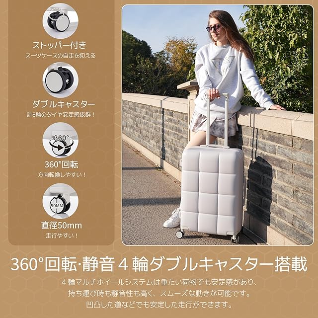 【頑丈な静音ダブルキャスター】360°独立に回転できるダブルキャスターが搭載し、海外に多い石畳やレンガ道でも滑らかに動かすことができます。8つの車輪に荷重が分散されるため耐久性にもすぐれています。また、 ストッパー機能を備えたデザイン、電車の中や坂道でも勝手に動く心配がなく安心です。旅行者の負担を軽減します。