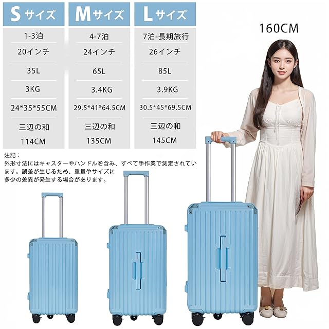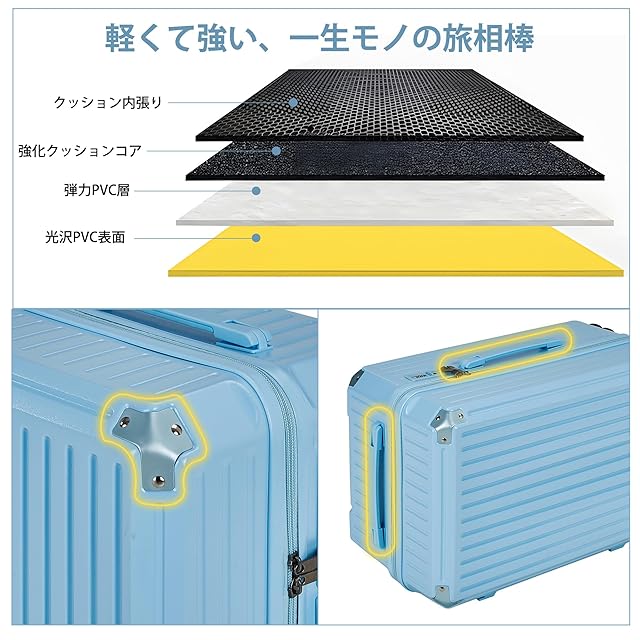 【軽量設計 & 耐久性】このキャリーケースはABS+PC素材を使用し、軽量で頑丈な設計。旅行中の負担を軽減します。防水・防スクラッチ加工で、天候や輸送環境に強く、長持ちします。アルミニウムコーナーガードで、角の衝撃を防ぎ、耐久性を向上。9面ハンドル付き設計で、どの角度からでも持ち運びが簡単。大型キャリーケースとしての利便性を最大限に活かし、機内持ち込みにも最適な軽量設計です。