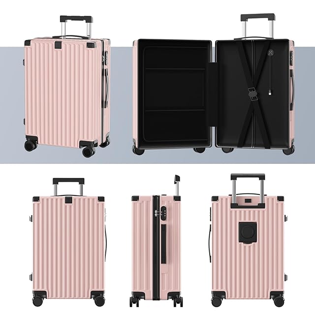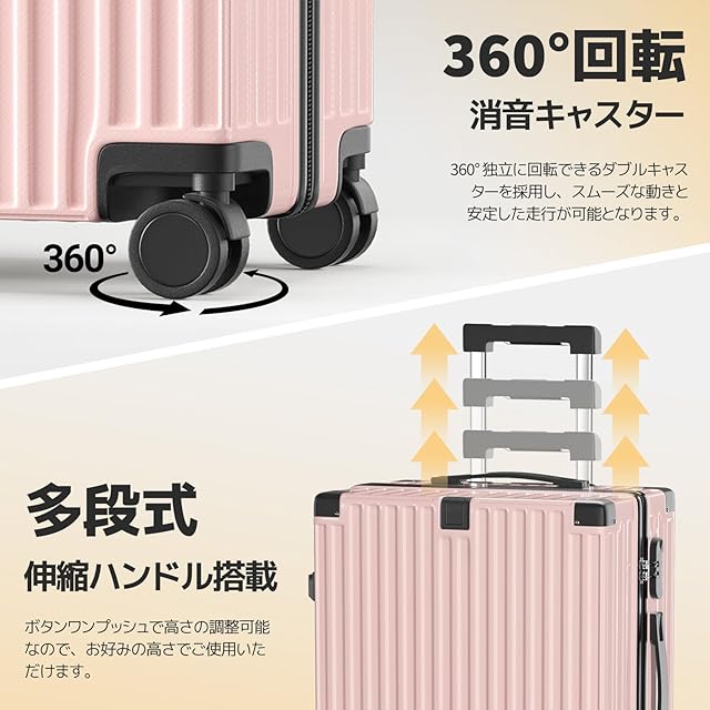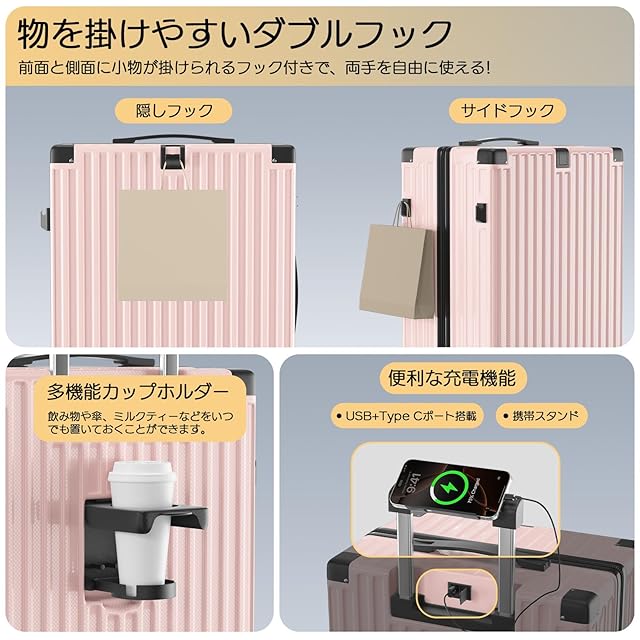 [SupTrip] スーツケース 機内持ち込み 超軽量 キャリーケース 多機能 キャリーバッグ USBポート付き カップホルダー付き 隠しフック機能 USB+Type C充電機能 大型 静音 ダブルキャスター 耐衝撃 360度回転 軽量 ビジネス 修学 泊まる 旅行 出張 (ピンク, M (4~6泊/65L))