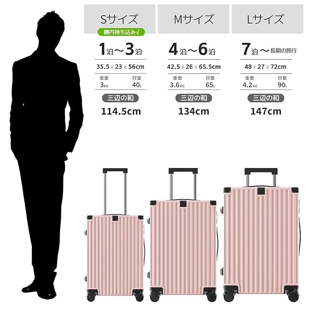 【サイズ情報】Sサイズ:35.5×23×56cm、三辺合計:114.5cm、機内持ち込み可。容量:40L、宿泊基準:1-3泊。Mサイズ:42.5×26.5×66cm。容量:65L、宿泊基準:4-6泊。Lサイズ:48×27×72cm。容量:95 L、宿泊基準:7泊~長期旅行。※商品の外寸は、トップとサイドハンドル、サイド固定脚、キャスターのマークを取る。寸法測定には若干の誤差がありますのでご了承ください。