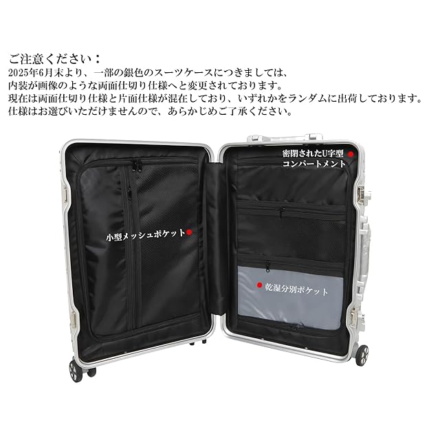 【合理的な収納仕切りで整理整頓も簡単】仕切り板は留め具でしっかり固定されており、移動中もズレにくく、荷物が散らかりません。メッシュポケット付きで収納物がひと目でわかります。後シェルにはクロスベルトも備えており、荷物の崩れをしっかり防ぎます。 ※2025年6月末より、一部の銀色のスーツケースにつきましては、内装が両面仕切り仕様へと変更されております(商品画像にてご確認いただけます)。 現在は両面仕切り仕様と片面仕様が混在しており、いずれかをランダムに出荷しております。仕様のご指定には対応いたしかねますので、あらかじめご了承ください。