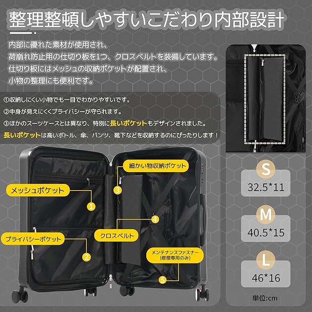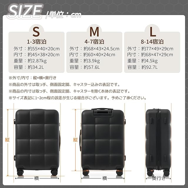 【商品仕様】※S size:外寸:約55×40×20cm 内寸:約45×38×20cm 本体重量:約2.87KG 、1~3泊に似合い。Sサイズは機内持込が可能なスーツケースです。飛行機内だけでなく、一人旅行や故郷帰りの新幹線やバスなどの車内移動も便利なスーツケースです。※M size:外寸:68×43×24.5cm 内寸:約60×40×24.5cm 本体重量:約3.9KG、4-7泊以上 。※L size:外寸:約77×49×29cm 内寸:約68×47×29cm 本体重量:約4.5KG、7泊以上。