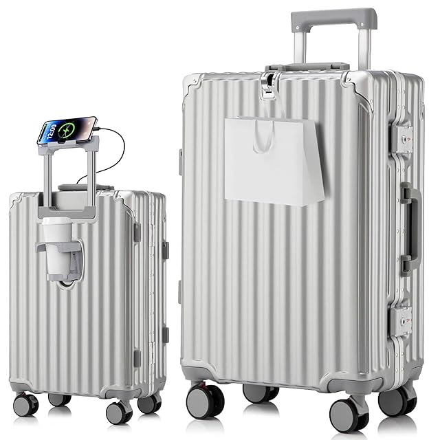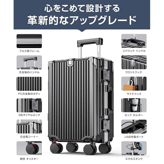 [Tatsui] スーツケース 機内持ち込み キャリーケース アルミ フレーム タイプ 大容量 ストッパー付き 耐衝撃 USBポート TSAローク搭載 カップホルダー付き 隠しフック機能 便利グッズ キャリー ケース 軽量 静音 大型 360度回転キャスター キャリーバッグ ビジネス 出張 旅行