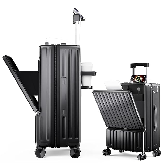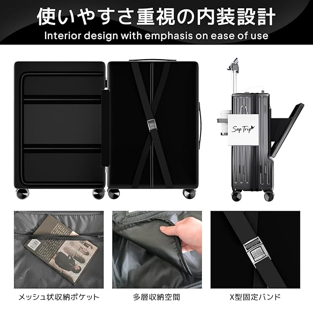 [SupTrip] スーツケース フロントオープン 多機能 キャリーケース 機内持ち込み 軽量 カップホルダー付き 隠しフック機能 キャリーバッグ USB+Type C充電機能 携帯スタンド TSAロック搭載 耐衝撃 静音 360度回転 キャリーバッグ 人気 おしゃれ 旅行 ビジネス 出張 修学 泊まる 入院 (ブラック, S(1~3泊/40L/機内持込))
