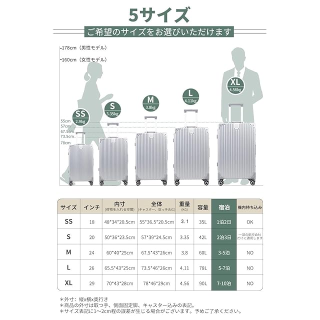【軽量で、大容量】人気のアルミフレームを採用しており、ビジネスでもカジュアルでもシーンを選ばずに使用できます。本体は耐久性に優れたABS樹脂とPC製で、密閉度の高いアルミフレームにより、ファスナーレスとなっております。【注意】フレームの材質だけがアルミニウムです。スタイリッシュでありながら、5サイズの重量はわずか3~5KG、それでいて容量は35ℓ~90ℓと国内旅行や小旅行には十分な大きさです。ご注意:シルバーのスーツケースの一部のロットは、両面仕切りに変更されていますのでご注意ください。両面仕切りとX型クロスベルトの内装はランダムにされます。