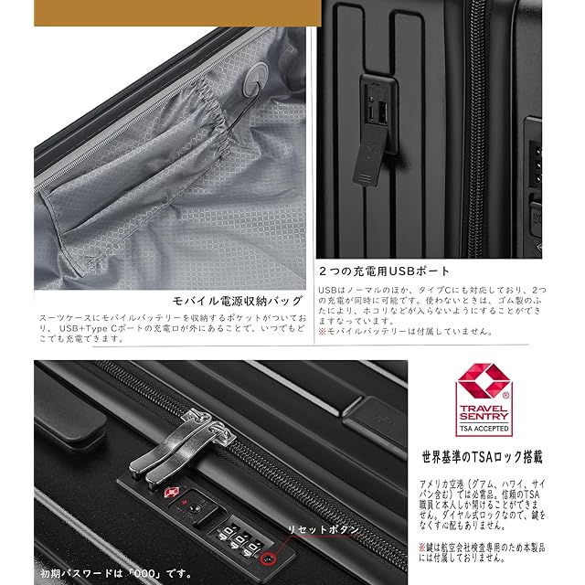 【USB+Type-C充電ポート】スーツケース内部にはモバイルバッテリー用の専用ポケットがあり、外部にはUSBとType-C充電ポートが装備されています。どこでも手軽にデバイスの充電が可能です。充電方法: スーツケース内のUSBケーブルをモバイルバッテリーの出力端子(OUTPUT)に接続してください。(入力端子(INPUT)には接続しないでください)。その後、ご自身のケーブルを使用してスマートフォンや他の電子機器をスーツケース側面の充電ポートに接続することで、デバイスの充電が可能です。*(モバイル電源は製品リストに含まれていないため、自分で用意する必要があることに注意してください。)