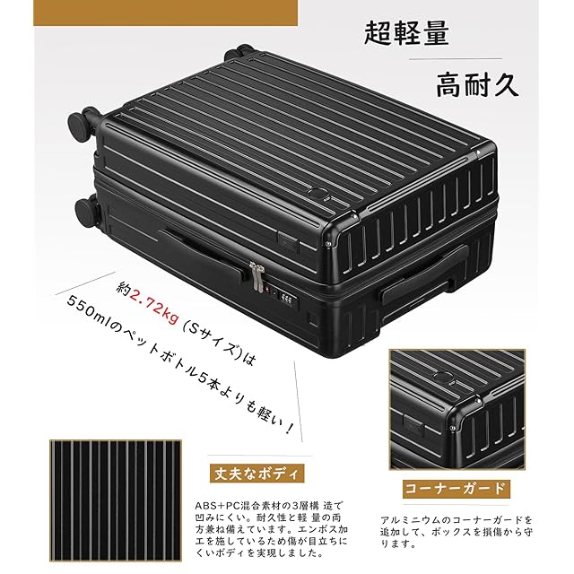 【卓越の耐久性・衝撃吸収プロテクション】このスーツケースは、ABS樹脂とPC(ポリカーボネート)を融合させたハイブリッド素材を採用しています。三層構造のデザインにより、軽量化を実現しながら優れた耐久性を発揮。旅行中の衝撃や負荷から大切な荷物をしっかりと守ります。