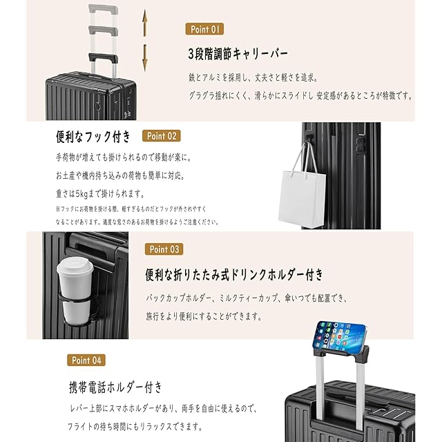【折りたたみ式ドリンクホルダー&スマホホルダー付きレバー】コーヒーカップや水筒、傘などをしっかりと固定できる折りたたみ式ドリンクホルダーが搭載されており、旅行中の利便性が向上します。レバーの上部にスマホホルダーが設置されているため、フライトの待ち時間や移動中に両手が自由になり、動画視聴や読書を快適に楽しめます。多段階調整で、自分に合った高さに調整できます。