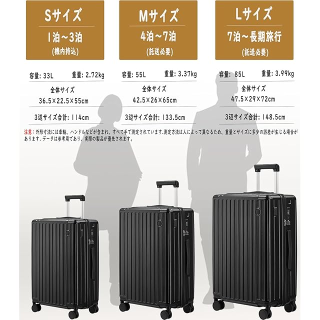 【サイズ】Sサイズの外寸は55*36.5*22.5cm、重さ:2.72kg 超軽容量、は33リットル、1~3泊に似合います。Sサイズは3辺全長114cmで機内持ち込み可能です。Mサイズの外寸は65*42.5*26cm、3辺の合計は133.5cmです、重さ:3.37kg 、容量は55リットル、4~7泊以上。Lサイズの外寸は72*47.5*29cm、3辺の合計は148.5cmです、重さ:3.99kg、 容量は85リットル、7泊以上。