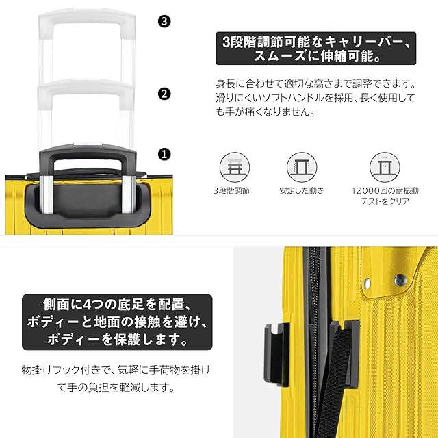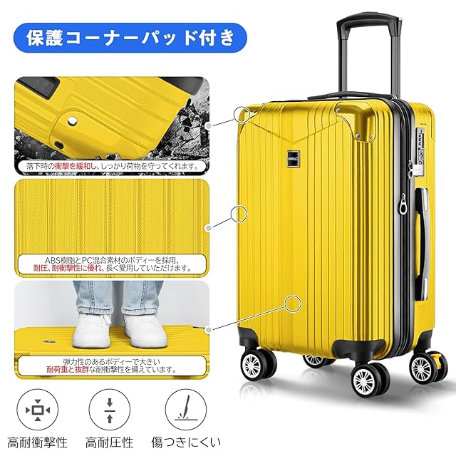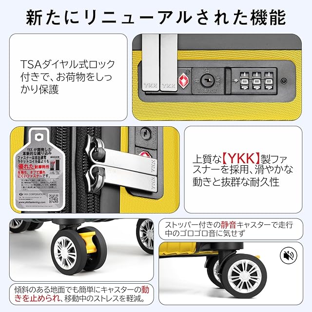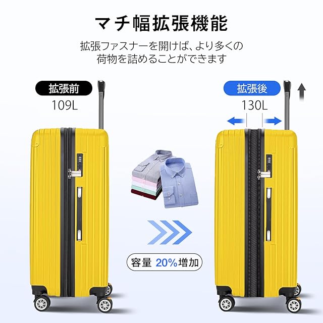 [VARNIC] スーツケース キャリーケース キャリーバッグ 【YKK】 製ファスナー 拡張機能 ストッパー付きキャスター TSAダイヤル式ロック 振動軽減 軽量 大容量 静音 乾湿分離ポケットつき スーツケースベルト付き 物掛けフック式底足 ファスナータイプ 旅行 ビジネス 出張 学生用キャリーケース (イエロー, L)
