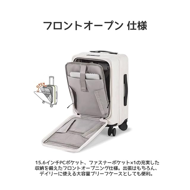 【新発売Sサイズ !便利なフロントオープン】立てたまま荷物の出し入れができる便利なフロントオープンスーツケースです。わざとケース全体を開けなくても、必要なものをすぐに取り出すことができます。15.6インチまでのPC、書籍、携帯電話、チケットなど荷物に合わせた細かなポケットを用意し、フロントポケット内の荷物の仕分けもラクラク。大型ポケットにはクッション材が入って、安心して荷物を運べる。