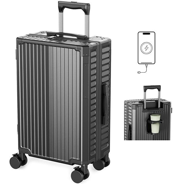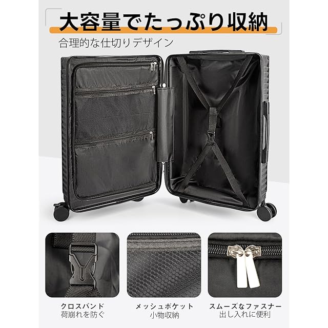 [Soralifer] スーツケース 機内持ち込み キャリーケース キャリーバッグ ストッパー付き静音キャスター USBポート付き ドリンクホルダー付き 物掛けフック 多機能スーツケース 軽量 静音 ファスナータイプ 旅行 ビジネス 出張 (ブラック, XLサイズ(7-8泊))